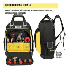Base Moldada: Mantém a mochila estável e evita tombos, mantendo suas ferramentas seguras e secas até em superfícies úmidas. Design Prático e Confortável: Alças ajustáveis e acolchoadas, zíper de fácil deslizamento e faixas refletivas para maior segurança. Grande Capacidade: Com 15 bolsos, elásticos e compartimentos para ferramentas de todos os tamanhos, facilitando o acesso rápido. Ideal para Profissionais: Perfeita para eletricistas, encanadores, e mais. Praticidade e organização para seu trabalho Marca: Airaj Marca: Airaj