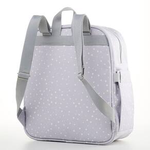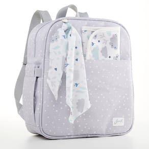 Compartimento principal com bolso plástico de fecho em zíper para roupinhas sujas. Na parte exterior, além de dois bolsos laterais ajustáveis com elástico para mamadeiras e copinhos, possui bolso frontal com fecho em botão magnético. A mochila acompanha trocador simples. Coleção em oxford nas cores cinza, bege e rosa. Possui forro emborrachado e impermeável. Acompanha lenço delicado com estampa em todas as peças.
