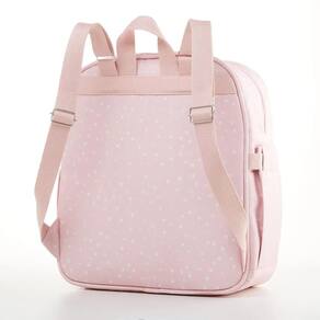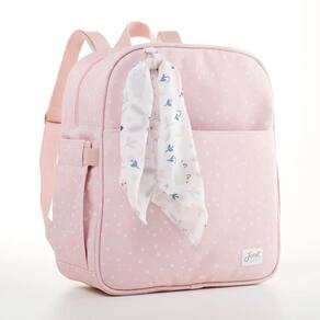 Compartimento principal com bolso plástico de fecho em zíper para roupinhas sujas. Na parte exterior, além de dois bolsos laterais ajustáveis com elástico para mamadeiras e copinhos, possui bolso frontal com fecho em botão magnético. A mochila acompanha trocador simples. Coleção em oxford nas cores cinza, bege e rosa. Possui forro emborrachado e impermeável. Acompanha lenço delicado com estampa em todas as peças.