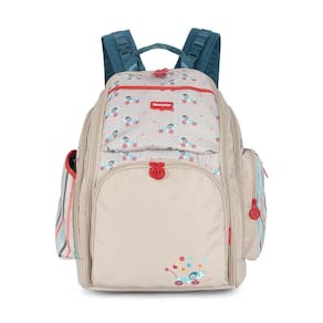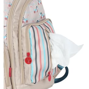 Compartimento principal de fecho em zíper. Na parte exterior, além de dois bolsos laterais sendo um deles com porta lenço, possui bolso térmico e impermeável. A mochila acompanha trocador simples. Possui alças ajustáveis e removíveis.