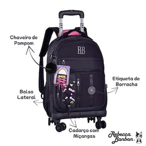 - Rodas 360º, mais mobilidade e leveza no transporte - Estampa oficial da Rebecca Bonbon - Compartimento principal espaçoso + bolso frontal com zíper - Alças de costas acolchoadas - Alça de Mão - Material resistente, leve e fácil de limpar - Cadarço Personalizado - Chaveiro Pesonalizado - Compartimento para Laptop+ Tablet - Forro Rosa Listrado