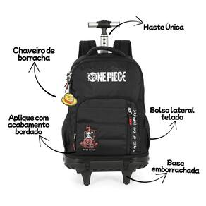 Mochila de Rodas Escolar One Piece – Aventuras escolares com o seu anime favorito! Ideal para os fãs do universo One Piece, essa mochila une praticidade, conforto e muito estilo. Possui base emborrachada resistente, logo estampado, chaveiro emborrachado exclusivo, aplique com acabamento bordado e ainda conta com alças acolchoadas e ajustáveis, perfeitas para os momentos em que for usada nas costas.