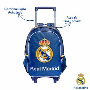 Características: - Confeccionada em Poliéster - Dois bolsos laterais em mesh - Estampa oficial do Real Madrid CF - Frente Sublimada + PVC Patch - Compartimento principal espaçoso - Alças de costas acolchoadas e ajustáveis - Rodinhas resistentes + alça retrátil estilo carrinho - Forro Interno Personalizado