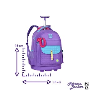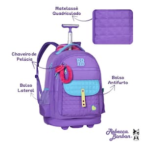 Características Mochila: - Estampa oficial da Rebecca Bonbon - Rodinhas resistentes - Alça De mão em Pelúcia - Chaveiros de Pelúcia - Matelassê Quadriculado - Compartimento de Laptop + Tablet - Forro Rossa Listrado - Proteção Para Rodas e Alças - Bolsos Laterais e Frontais
