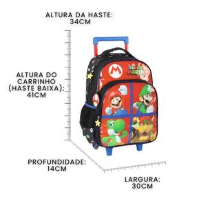 Mochila De Rodas Super Mario Bros Escolar Passeio - Luxcel Apresentamos a incrível Mochila de Rodas Super Mario, perfeita para as aventuras escolares do seu filho Com um design divertido que traz a icônica presença do Super Mario, não é apenas estilosa, mas também super funcional. A mochila de rodas do Super Mario facilita o transporte, ideal para meninos em idade escolar. Com estampa vibrante dos personagens, alças ajustáveis e amplo espaço interno, é perfeita para o dia a dia na escola com estilo e diversão. Características Mochila: Alça de mão Alça de costas Bolsos laterais Identificador personalizado Puxadores em Zíper Especificações Mochila: Marca: Super Mario Medidas Aproximadas Mochila A x L x P : 41cm x 30cm x 14cm Peso: 815g Aprox Capacidade: 17L Composição do produto: Poliéster e PVC Conteúdo da Embalagem: IC41392MO - 1 Mochila Rodas Super Mario As cores podem variar entre as imagens mostradas acima e o produto. Imagens meramente ilustrativas. Todas as informações divulgadas são de responsabilidade exclusiva do fabricante. de 90 dias contra defeito de fabricação. Marca: Não Informado Ean: 7891437460337