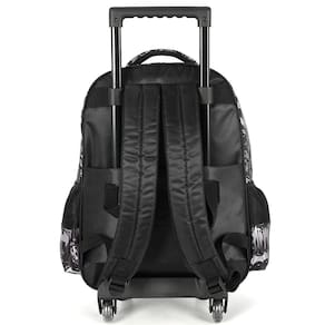 Mochila de rodinhas com alça, bolsos laterias em tela com elástico, alças de costas espumadas e reguláveis, silk frontal, bolso frontal com zíper, alça de mão e etiquetas personalizadas.