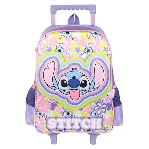 Com estampa do Stitch e um design funcional, a mochila oferece espaço ideal e transporte facilitado por rodinhas e puxador retrátil
