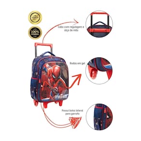 Rodinhas: Facilitam o transporte, tornando o caminho para a escola mais leve e divertido. Duplo compartimento: Organiza os materiais escolares com mais praticidade. Bolsos laterais: Ideais para garrafinhas de água e outros pequenos objetos. Alças de mão e de puxar: Versatilidade para carregar a mochila da maneira mais confortável. Cursores personalizados: Um toque especial que encanta os pequenos super-heróis. Material resistente: Garante durabilidade e acompanha o menino em todas as aventuras.