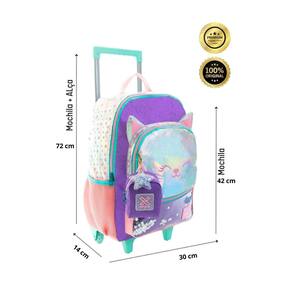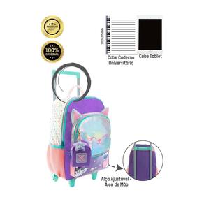 A mochila de rodinha gatinha é perfeita para as pequenas fashionistas que amam tudo que é brilhante e divertido. Com detalhes holográficos e glitter, ela é a companheira ideal para levar todos os materiais escolares com muito estilo.