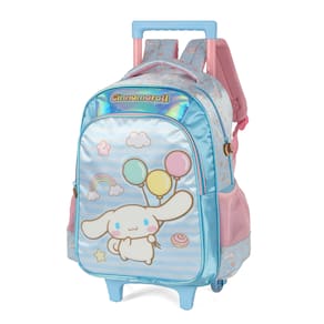 Produzida pela Luxcel, com materiais de alta durabilidade e fácil limpeza; Alça de mão reforçada e alças de costas ajustáveis e acolchoadas; Puxador em alumínio com regulagem de altura; Rodinhas resistentes para facilitar o transporte; Bolso frontal com estampa exclusiva e detalhes holográficos do Cinnamoroll; Bolsos laterais em redinha ideais para garrafinha e pequenos acessórios; Amplo espaço interno para guardar livros, cadernos e materiais escolares.