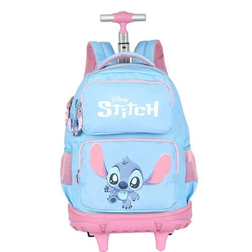 Mochila de rodinhas com alça, bolsos laterias em tela com elástico, alças de costas espumadas e reguláveis, silk frontal, bolso frontal com zíper, alça de mão e etiquetas personalizadas.