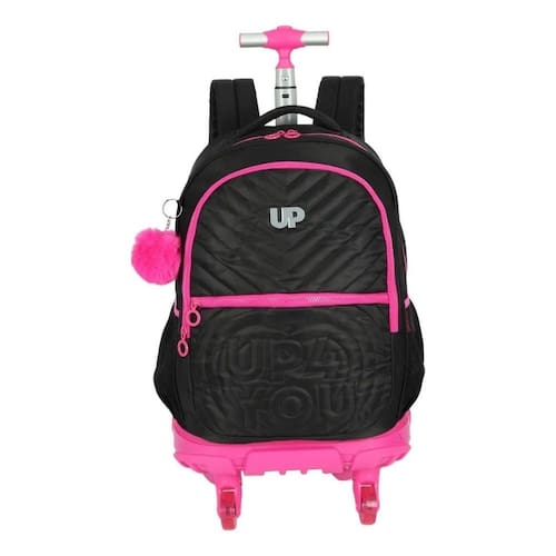 Mochila Escolar Rodinhas COM GIRO 360 Graus Up4You A Mochila é feita poliéster e tem design exclusivo e diferenciado da marca. O carrinho é feito em alumínio e possuem 4 rodinhas de skate 55mm , proporcionado leveza e facilidade ao transporte. O puxador com botão para regular a altura. Ela também pode ser usada nas costas pois possui alças ajustáveis e macias que se adaptam ao corpo. Vem com alça de mão fixa. CARACTERÍSTICA: -Possui bolso superior para guardar o puxador do carrinho - 4 Rodinhas dupla 360 Graus ( rodas de skate) - Material : 100% Poliéster / Forro: 100% Poliéster - Alça de mão reforçada. - Alça de costas reguláveis - 2 Bolso frontal - 2 Bolso Lateral para garrafa - Chaveiro Pompom -1 Metro de Puxador Total Levantado - Possui fechamento em zíper - Puxadores personalizados - Logo Up4You Metálico - Carrinho em alumínio com puxador e rodinhas - Mochila super leve e resistente. - Marca: Luxcel - Dimensões aproximada: 54x33x25 cm (AxCxL) Desenho Do Tecido: Liso Indicado Para: Escola Modelo: MC49092UP-PT Tipo De Mochila: Escolar