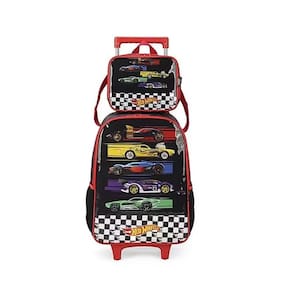 Kit mochila de rodinhas e lancheira luxcel hot wheels Kit mochila de rodinhas com bolsos laterias em tela com elástico, alças de costas espumadas e reguláveis, silk frontal, bolso frontal com zíper, alça de mão. Lancheira estampada com alça de costas e alça de mão, além de etiquetas personalizadas.