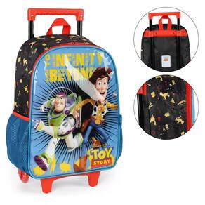 Características; Ocasião: Escolar, dia a dia Alça de mão Haste ajustável 2 Rodinhas de silicone 1 Compartimento 2 Bolsos laterais para garrafa Etiqueta de identificação nas costas Estampa personalizada Toy Story