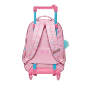 Mochila de rodinhas Lilica Ripilica com alças de costas, que conta com estampa frontal, bolso frontal, telinha lateral, compartimento grande com fechamento em zíper e etiquetas personalizadas.