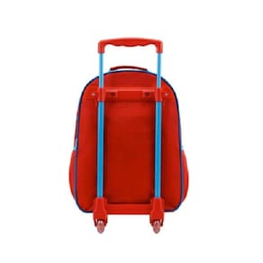 Em tamanho 14, produzida em poliéster resistente e estampado. Painel frontal PVC vincado com detalhes com glitter - Compartimento principal amplo , 2 bolsos laterais mesh, zíper com puxadores personalizados, alça de mão em nylon com poliester e piping forrado. Carrinho em metal com travas.