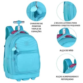 A mochila da linha Rebecca Bonbon, da Clio Style, é um item perfeito para quem busca unir estilo, funcionalidade e durabilidade. Com medidas de 35cm x 48cm x 19cm, esta mochila se destaca por seu design charmoso e prático. Equipada com rodinhas de silicone e uma haste que se eleva até 99cm, é ideal para facilitar o transporte.