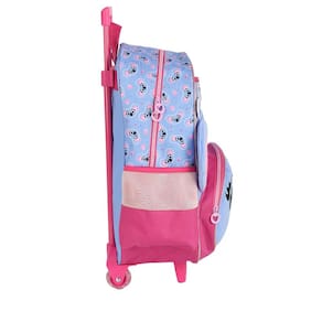 Mochila de rodinhas sem alça, bolsos laterias em tela com elástico, silk frontal, bolso frontal com zíper, alça de mão e etiquetas personalizadas.