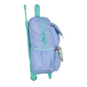 Mochila de rodinhas sem alça, bolsos laterias em tela com elástico, silk frontal, bolso frontal com zíper, alça de mão e etiquetas personalizadas.