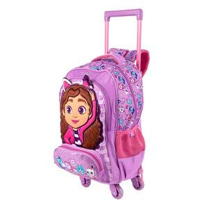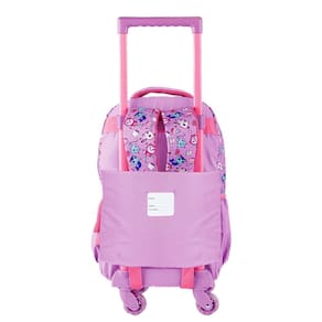 Mochila com bolsos laterias em tela com elástico, tag identificador, painel frontal em cetim, pés de apoio, alça de mão e etiquetas personalizadas.