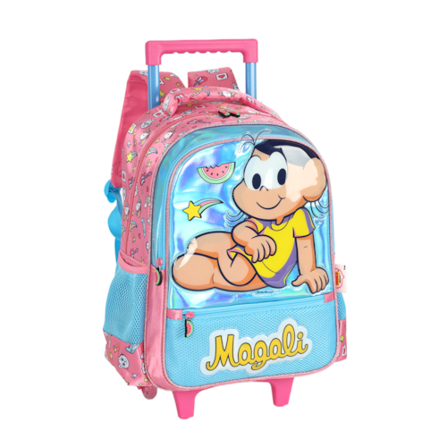 Design exclusivo da Magali: estampa vibrante com efeito brilhante e detalhes fofos da personagem e suas famosas melancias. Rodinhas resistentes: facilitam o transporte, trazendo praticidade para o dia a dia escolar. Alça retrátil ajustável: para puxar a mochila com conforto. Alças acolchoadas: opção de uso também nas costas. Compartimento principal amplo: ideal para cadernos, livros e pastas. Bolso frontal com zíper: perfeito para guardar objetos menores. Bolsos laterais em tela: ideais para garrafinhas e acessórios. Material de qualidade: resistente e fácil de limpar.