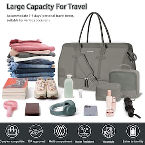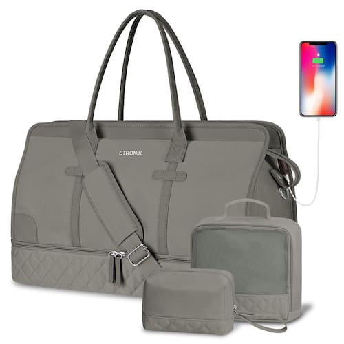 Large Capacity Travel Bag with Separate Shoe Compartment for Travel, Gym, Yoga Portable Travel Duffel Bag, multifunctional Gym Duffel Bag: This weekender travel bag can be used as a weekender bag/carry-on bag/overnight travel bag/weekender travel bag/gym duffel bag/travel bag/short journey bag. Color: Beige Material: Waterproof Nylon Fabric Style: Handbag, Shoulder bag, Messenger bag Package includes: Travel bag x 1 Shoe bag x 2 Toiletry bag x 1 Luggage tag x 1 Clothing storage bag x 1 Detachable shoulder strap x 1 - Conjunto atualizado de 3 peças: a bolsa de viagem vem com 1 bolsa de fim de semana para mulheres para ajudar você a organizar e maximizar seu espaço ao viajar. 1 bolsa de armazenamento de roupas para ajudar a classificar, organizar e localizar roupas rapidamente. 1 bolsa de higiene pessoal para guardar seus cosméticos e produtos de higiene pessoal. A bolsa esportiva ETRONIK para viagem é feita de materiais grossos e resistentes, proporcionando uma experiência de transporte confortável - Bolsa de viagem de tamanho grande para mulheres: a bolsa de viagem de item pessoal com vários bolsos e compartimentos para organização de coisas, espaço espaçoso pode caber em 2-3 dias de itens essenciais de viagem, cabe facilmente em suas roupas, artigos de higiene pessoal, sapatos, laptop e outros itens. Na parte de trás da bolsa há um bolso para facilitar o acesso ao seu smartphone, identidade ou passaporte. Equipado com uma porta de carregamento USB embutida, perfeita para carregar seu telefone ou outros dispositivos durante a viagem - Bolsa de ginástica separada a seco e compartimento separado para sapatos: a bolsa interna de separação seca e úmida é feita de material resistente à água de alta densidade, pode ajudar você a separar itens secos e molhados, se você tiver roupas ou toalhas molhadas, pode colocá-las na bolsa úmida; esta bolsa esportiva feminina tem um compartimento inferior separado para seus sapatos e outros. Também pode ser usada como bolsa hospitalar - Bolsas de mão para aviões: tamanho grande (A x L x C) 47 x 23 x 31 cm / 18,5 x 9 x 12 pol., a bolsa esportiva ETRONIK atende à maioria dos requisitos internacionais de bagagem de mão. Leve esta bolsa de mão como itens pessoais durante o voo, você pode colocá-la no compartimento superior e embaixo do assento. O design da alça de bagagem faz com que esta bolsa possa ser colocada em sua bagagem dobrável, esta bolsa de embarque para o fim de semana é perfeita para suas viagens pessoais - Bolsa esportiva de ampla aplicação: se você está procurando uma linda bolsa de viagem, seria uma ótima opção. Tem uma alça de bagagem para deslizar sobre sua bagagem de rolo, também tem uma alça de ombro acolchoada ajustável para bolsa ou estilo transversal. Você nunca mais terá dificuldades no aeroporto com essas escolhas principais. Use-a como uma bolsa esportiva, bolsa de viagem de avião, bolsa de bagagem, bolsa esportiva de academia, bolsa de fim de semana, bolsa de mão, bolsa de hospital ou bolsa de praia