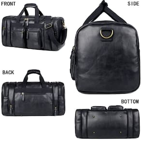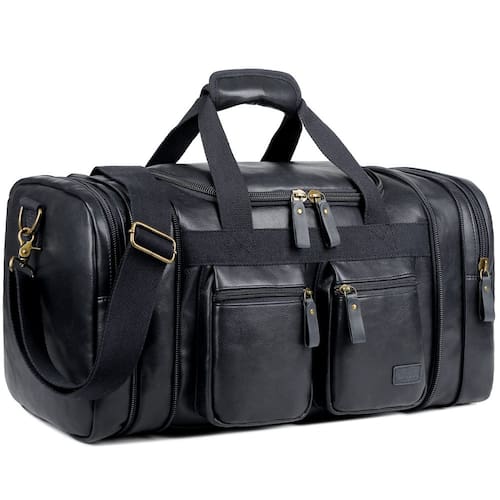 Bolsa esportiva esportiva de couro vegano para viagem de fim de semana HB-21, Preto, Bolsa de viagem de couro - Material: Couro sintético macio e forro de cor vermelha - 99% como couro verdadeiro e não machuca animais - Design expansível: 21,2 x 10,2 x 11 polegadas/54 x 26 x 28 cm (CxLxA); Alça de ombro: 70,1 cm - 133,1 cm - Manga de bagagem: a manga traseira permite que você a deslize sobre a mala/bagagem/alça de bolsa de rodinhas - Grande capacidade: esta bolsa pode caber em 3-4 dias de itens essenciais do dia a dia, como roupas, sapatos, copos, laptop de 15 polegadas, iPad Air e outros dispositivos eletrônicos. - Continue: nossa bolsa é projetada para atender aos regulamentos de voo e requisitos para bagagem de mão.