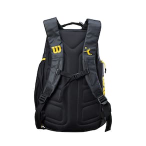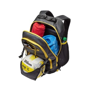 Mochila de vôlei de praia Wilson AVP - preta/amarela - Mochila de vôlei de praia Wilson AVP - Preta/amarela - Suporte de vôlei: um painel frontal fácil de encaixar serve para uma bola de vôlei de tamanho oficial - CLIPES LATERAIS: os clipes de velocidade nas laterais da bolsa permitem que você areje roupas ou equipamentos molhados após um treino ou um dia na praia - BOLSOS ESPECIALIZADOS: o bolso térmico regula a temperatura de lanches quentes ou frios durante a viagem, enquanto bolsos escondidos e uma capa para laptop mantêm seus objetos de valor protegidos — À PROVA DE AREIA: uma conveniente liberação/ventilação de armadilhas de areia permite que você esvazie rapidamente a areia da mochila sem remover e sacudir seu equipamento - DURABILIDADE EM TODAS AS ESTAÇÕES: um material externo e uma base duráveis permitem o uso frequente em ambientes internos e externos - OFICIAL: marcado com gráficos oficiais do AVP