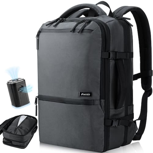 Dinictis Mochila Airback com bomba, expansível até 60 L com compressão a vácuo, mochila Vacpack para viagens, Cinza escuro, Mochilas de viagem - Compressão a vácuo: Design de válvula de saída unidirecional, não é fácil de expandir após a compressão. Você pode pressionar manualmente ou combinar com a bomba para comprimir rapidamente o volume do compartimento e melhorar a utilização do espaço da bagagem. Extremamente adequada para embalar roupas fofas (jaquetas, parkas, casacos, suéteres). Para garantir o efeito de compressão, o zíper hermético é utilizado, o que é mais difícil de abrir e requer força. - Mochila de mão expansível: a mochila airback oferece espaço extra quando necessário e, quando totalmente expandida, tem a capacidade de uma mala de 61 cm. Oferece muito espaço para todos os seus itens essenciais e atende aos regulamentos das companhias aéreas para itens pessoais, além de sua praticidade - Mestre organizador: a mochila de viagem é cuidadosamente colocada com compartimentos e bolsos para organizar efetivamente seus pertences. O compartimento principal tem um bolso molhado para itens úmidos separados, um compartimento separado para um laptop de até 17 polegadas e um bolso traseiro de privacidade para manter seus pertences identificados durante a viagem. O compartimento principal espaçoso comporta facilmente de 10 a 20 roupas, o que o torna perfeito para viagens curtas e longas. - Confortável e ergonômica: a mochila a vácuo é acolchoada com esponja de colmeia nas costas, ergonômica, respirável e dissipação de calor; combinada com alças elásticas largas e flexíveis para deixar toda a parte de trás dos ombros uniformemente estressada, muito tempo para se manter confortável. Alças de carrinho para prender a mochila ao estojo. - Garantia de qualidade: a mochila é feita de tecido resistente à abrasão e resistente à água, que apresenta excelente durabilidade e praticidade para todos os tipos de clima. É útil para aqueles que gostam de levar coisas leves, mas precisam de mais espaço de armazenamento para viagens longas, tornando-a a primeira escolha para viajantes que precisam otimizar seu espaço de bagagem.