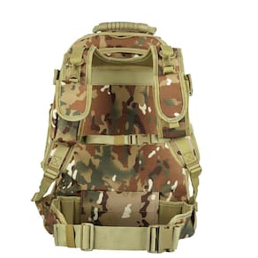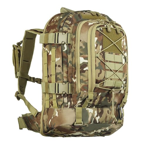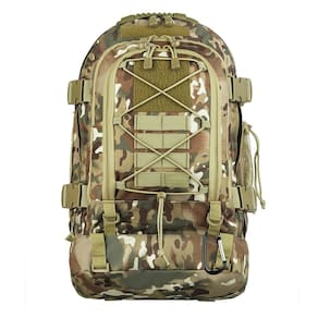 tecido 600 d resinado em pvc resistente à água sistema molle para acoplar módulos 4 compartimentos zíperes duplos correias de compressão laterais e frontais alças com porta equipamentos removíveis múltiplos organizadores internos cintos de fixação na cintura e no tórax acompanha mosquetão bolso lateral para garrafa compatível com refis de hidratação até 2 refis de 3l sistema de expansão de capacidade: mais 15l tiras aderentes de identificação