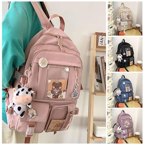 O tecido externo é leve, resistente à abrasão e com revestimento que ajuda a repelir água da chuva, combinado a zíperes metálicos de deslizamento suave. As alças de ombro duplas são acolchoadas e ajustáveis, ajudando a reduzir a pressão nos ombros, enquanto os acessórios decorativos – pinos, pingente de pelúcia e cartões – reforçam o estilo casual e jovem, fácil de combinar com diferentes looks.