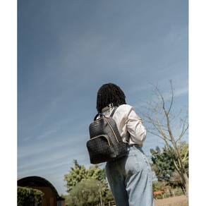 Mochila feminina com estampa exclusiva de elementos gráficos em padrão geométrico, trazendo um visual moderno e elegante para o dia a dia.
