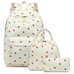 Modelo: Mochila escolar juvenil 3 peças estampa morangos fundo bege