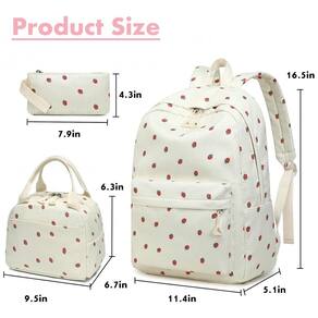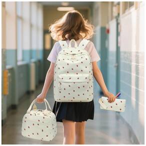 O tecido em poliéster é leve, resistente e adequado para uso diário, enquanto as alças de ombro acolchoadas e ajustáveis ajudam a reduzir a pressão nos ombros durante o transporte. A lancheira térmica, com dimensões que acomodam marmitas, frutas e bebidas, possui interior isolado para auxiliar na conservação dos alimentos, e o estojo acompanha o conjunto para organização de lápis, canetas e pequenos acessórios, mantendo visual coordenado em bege com estampa de morangos.