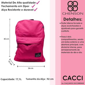 Mochila Escolar Casual Leve Espaçosa Resistente Chenson é confeccionada em material resistente, com base reforçada, parte interna forrada e alças acolchoadas e ajustáveis para garantir conforto a quem utilizá-la. Possui dois compartimentos, sendo um bolso externo e uma abertura principal, com divisória interna, para armazenamento de materiais do dia a dia.