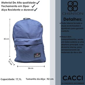 Mochila Escolar Casual Leve Espaçosa Resistente Chenson é confeccionada em material resistente, com base reforçada, parte interna forrada e alças acolchoadas e ajustáveis para garantir conforto a quem utilizá-la. Possui dois compartimentos, sendo um bolso externo e uma abertura principal, com divisória interna, para armazenamento de materiais do dia a dia.