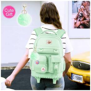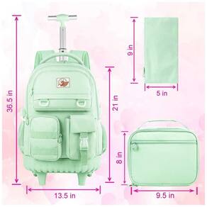 Mochila escolar CCJPX com rodinhas, indicada para meninas, adolescentes e mulheres, combinando uso como mochila e como mala com rodas para escola, viagens e deslocamentos diários. A estrutura inclui compartimento principal amplo com bolso acolchoado para notebook, bolso antirroubo, compartimento intermediário com divisórias, três bolsos frontais e dois bolsos laterais em tela, permitindo organizar livros, cadernos, materiais de escrita, garrafas e itens pessoais. ? O sistema com rodas duplas deslizantes, alça retrátil ajustável, alças de ombro acolchoadas e dobráveis e base com proteção em borracha favorece o uso tanto em piso plano quanto em transporte nas costas. A lancheira possui corpo rígido com revestimento impermeável e alça posterior para fixação na estrutura da mochila, enquanto o estojo coordenado e os acessórios decorativos complementam o uso escolar e em viagens.