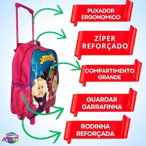 Vem com uma mochila de rodinhas com compartimento principal espaçoso ideal para acomodar os livros, cadernos e materiais escolares no geral e mais dois bolsos laterais de redinha para garrafas.