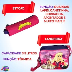 Vem com uma lancheira térmica com espaço suficiente para levar todo lanchinho da criança e mantê-los frescos, tem alça para ser carregada na mão ou no ombro e também vem com alça para encaixe na mochila. Além disso, vem com um estojo para acomodar todos os lápis de cor e canetinhas.