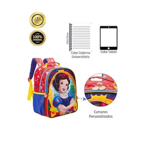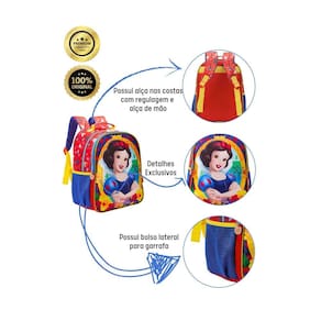 Design exclusivo: Estampa da Branca de Neve com detalhes encantadores. Material resistente: Garante durabilidade e resistência no dia a dia escolar. Fechamento por zíper: Facilita o acesso ao compartimento principal. Alças de costas acolchoadas com regulagem: Adapta-se ao tamanho de cada criança, proporcionando conforto e ergonomia. Alça de mão: Permite carregar a mochila de diferentes formas. Bolso lateral para garrafa: Ideal para transportar bebidas com praticidade. Cursor personalizado: Um toque especial que as meninas vão adorar.
