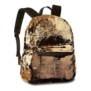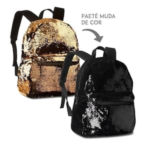 - mochila confeccionada em material poliéster. - com bordado em paetê de dupla face sendo preto e dourada - com alças acolchoada com regulagem. - com alça de mão. - com zipe personalizado.