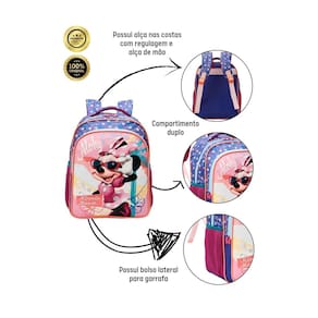 Estilo e funcionalidade: Combina o design encantador da Minnie com a praticidade de uma mochila escolar. Conforto: as alças acolchoadas e reguláveis garantem o conforto durante o transporte. Organização: dois compartimentos e bolso lateral para garrafa facilitam a organização dos materiais. Perfeito para presente: Ideal para presentear as pequenas fãs da Minnie em qualquer ocasião.