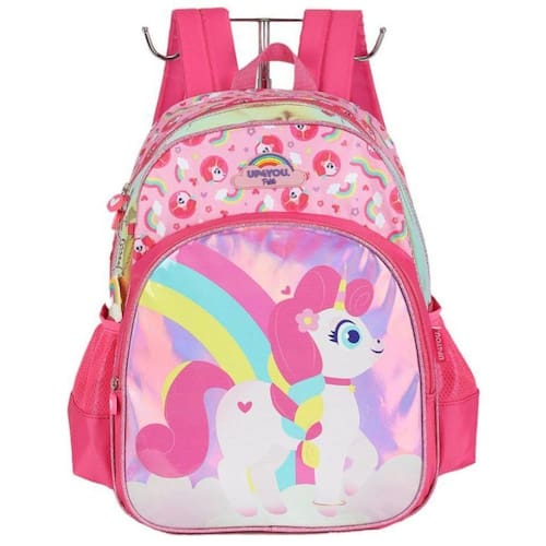 Mochila escolar de costas unicórnio Cor: rosa Descrição do produto Mochila de costas luxcel up4you unicórnio. Mochila com bolsos laterias em tela com elástico, alças de costas espumadas e reguláveis, silk frontal, bolso frontal com zíper, alça de mão e etiquetas personalizadas. Características principais:. Dimensões: aproximadamente 41 x 30 x 14cm axlxp ., volume: aproximadamente 17 litros., contra defeito de fabricação., . Nome: mochila de costas luxcel up4you unicórnio colorido Gênero: unissex Departamento bs: acessórios Indicado para: dia a dia Origem: nacional Ean: 6931759255943