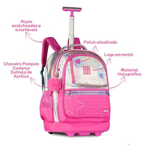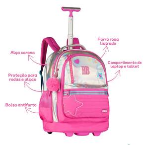 Características: - Alça de mão - Alça de costas acolchoadas e ajustáveis - Bolsos laterais telados - Forro interno rosa listrado - Compartimento de Laptop e Tablet - Mosquetão formato de coração - Chaveiro pompom, cadarço e estrela acrílico - Logo metalizado - Patches atoalhados - Puxador personalizado - Zíper tratorado - Proteção para rodas e alças - Estrutura do carrinho em alumínio