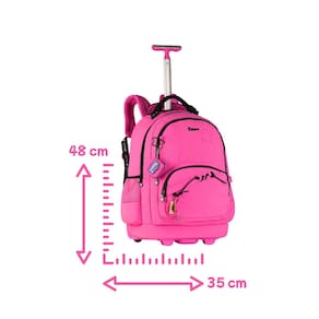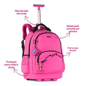 Características: - Alça de mão em cordas - Alça de costas - Chaveiro personalizado com porta fones de ouvido - Mosquetão de estrela - Placa em acrílico com QR code - Forro rosa de poá - Proteção para rodas e alças - Puxador personalizado - Compartimentos para laptop e tablet