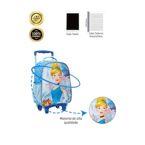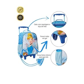 Mochila de Rodinhas da Cinderela Um sonho encantado a cada passo A mochila de rodinhas da Cinderela é mais do que apenas um acessório escolar. É um convite para um mundo de magia e encanto, onde os sonhos se tornam realidade. Com design inspirado na princesa mais amada da Disney, essa mochila é perfeita para meninas que adoram a Cinderela e buscam um item funcional e estiloso para o dia a dia. Principais características: Rodinhas: Facilitam o transporte, tornando o caminho para a escola mais leve e divertido. Bolsos laterais: Ideais para garrafinhas de água e outros pequenos objetos. Alças de mão e de puxar: Versatilidade para carregar a mochila da maneira mais confortável. Cursores personalizados: Um toque especial que encanta as pequenas princesas. Material resistente: Garante durabilidade e acompanha a criança em todas as aventuras. Qualidade: Confeccionada com materiais duráveis, a mochila acompanha a criança por muito tempo. Ideal para: Meninas fãs da Cinderela: Um presente perfeito para encantar as pequenas princesas. Dia a dia escolar: Organiza os materiais escolares e torna o caminho para a escola mais divertido. Viagens e passeios: Ideal para transportar brinquedos e lanches.