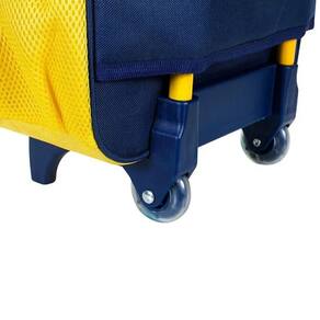 Sistema de Rodinhas Premium - Estrutura azul marinho resistente com rodinhas duplas e alça retrátil amarela para transporte sem esforço