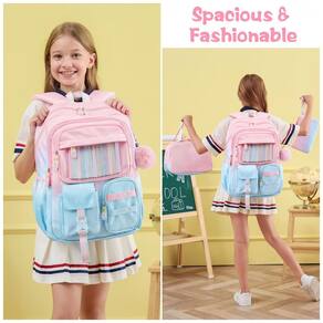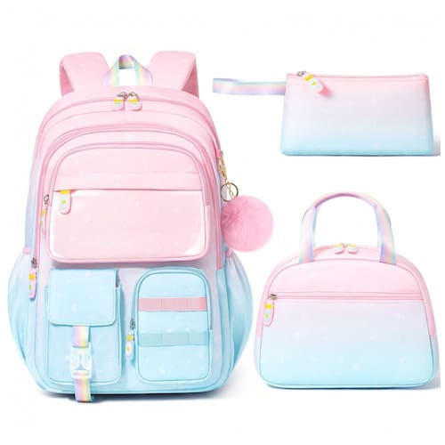 Conjunto escolar 3 em 1 composto por mochila em degradê de cores, lancheira térmica e estojo, indicado para crianças e adolescentes em idade pré-escolar, ensino fundamental e médio. A mochila possui compartimento principal com sleeve acolchoado para notebook ou tablet de até 15", espaço para livros e cadernos, seções intermediárias com zíper para cadernos e estojos, bolso transparente para horários ou fotos, quatro bolsos frontais para lanches e pequenos objetos e dois bolsos laterais com elástico para garrafas e guarda-chuva.