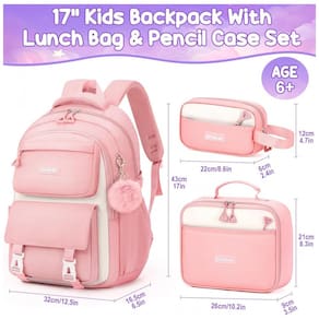 O conjunto é produzido em poliéster leve, impermeável, de fácil limpeza e livre de BPA, com alças de ombro acolchoadas, ajustáveis e respiráveis, além de encosto com material respirável que auxilia na dissipação de calor e absorção do suor. A lancheira com isolamento em múltiplas camadas mantém alimentos em temperatura adequada por várias horas, enquanto o estojo com dois compartimentos com zíper organiza lápis, canetas, marcadores e pequenos acessórios escolares, complementado por pingente em pelúcia macia no padrão rosa com bege.