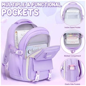 O conjunto é produzido em poliéster leve, impermeável, de fácil limpeza e livre de BPA, com alças de ombro acolchoadas, ajustáveis e respiráveis, além de encosto com material respirável que auxilia na dissipação de calor e absorção do suor. A lancheira com isolamento em múltiplas camadas foi projetada para manter alimentos em temperatura adequada por várias horas, enquanto o estojo com dois compartimentos com zíper organiza lápis, canetas, marcadores e pequenos acessórios escolares, complementado por pingente em pelúcia macia no padrão roxo com bege.